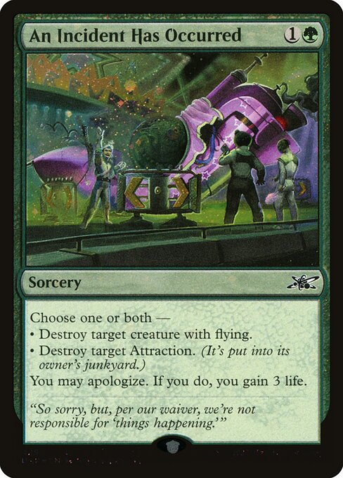 Choose one or both — • Destroy target creature with flying. • Destroy target Attraction. (It's put into its owner's junkyard.) You may apologize. If you do, you gain 3 life.